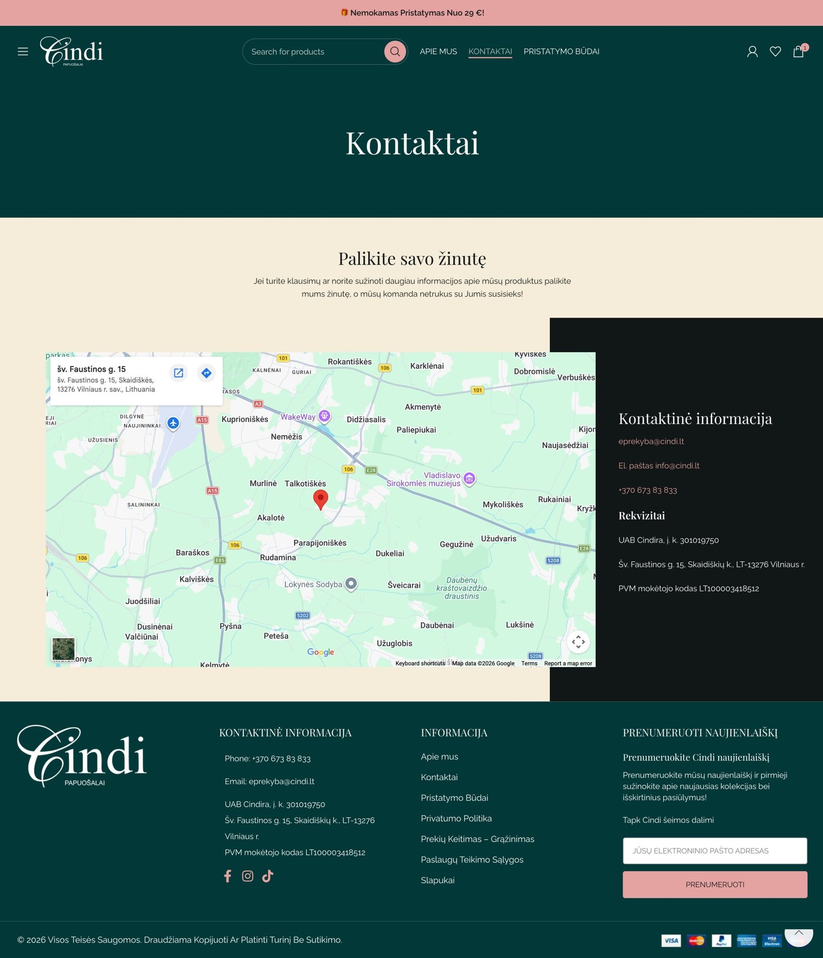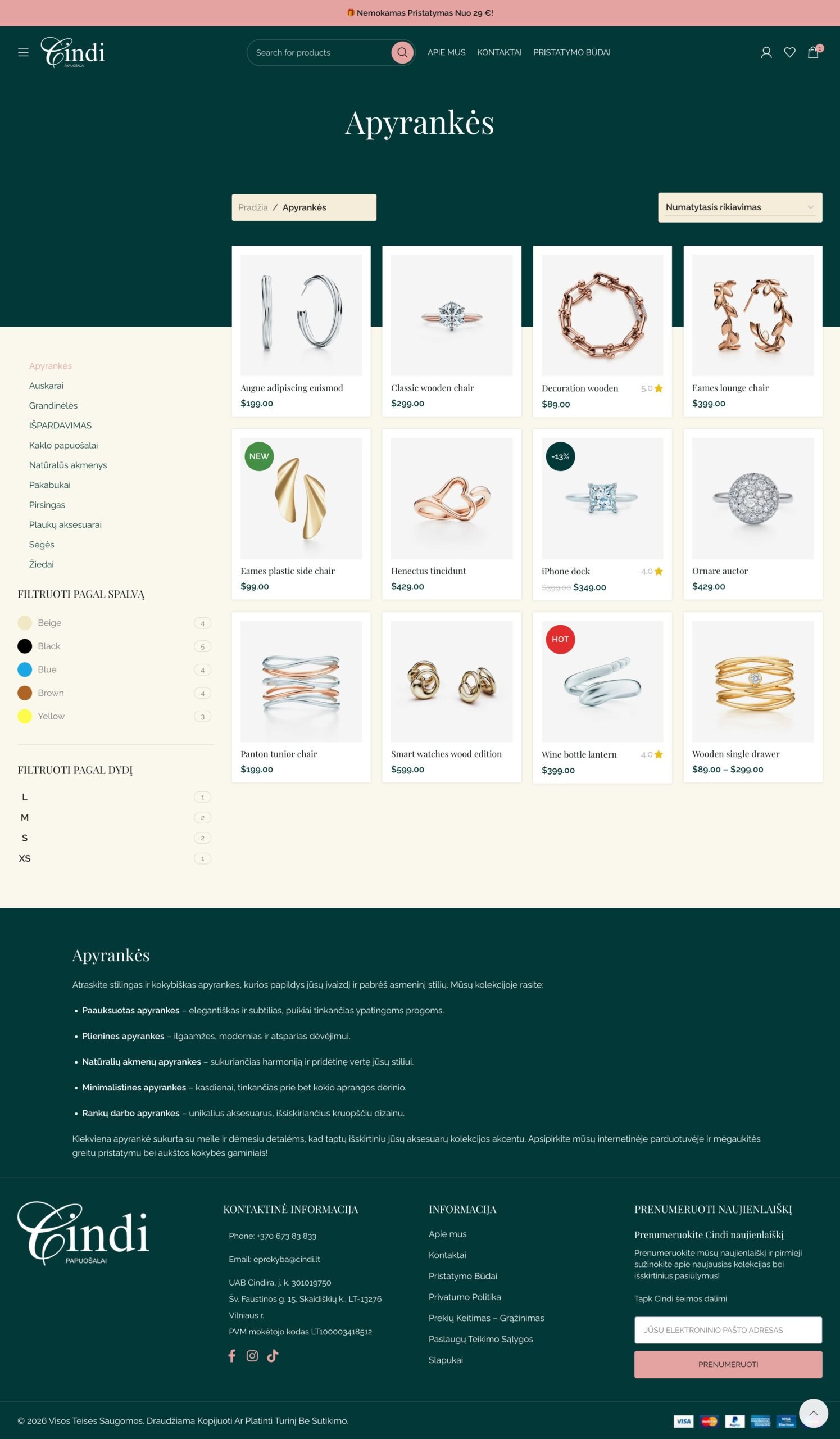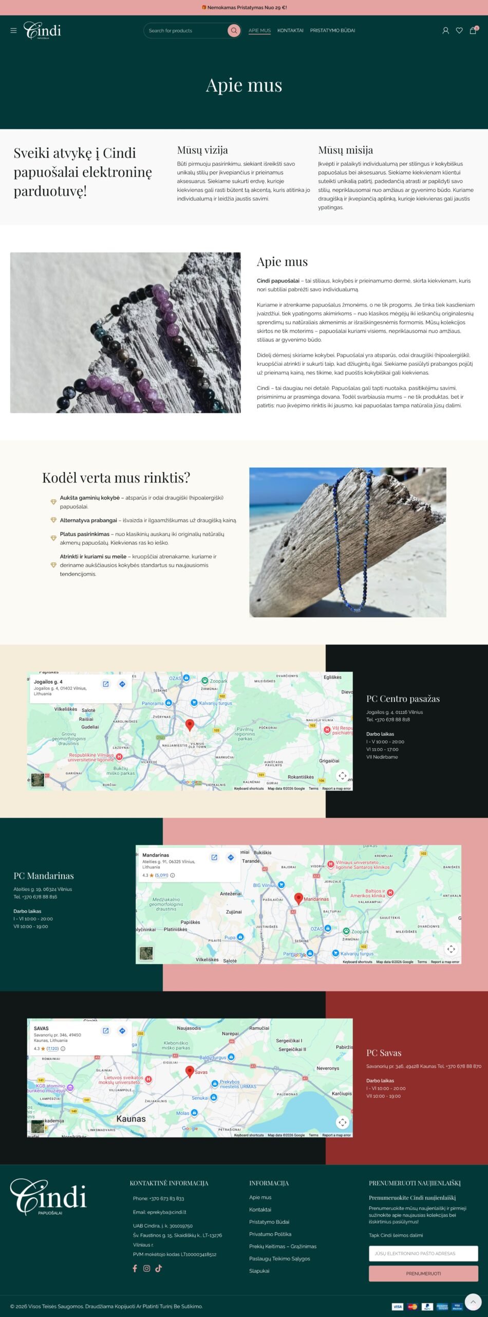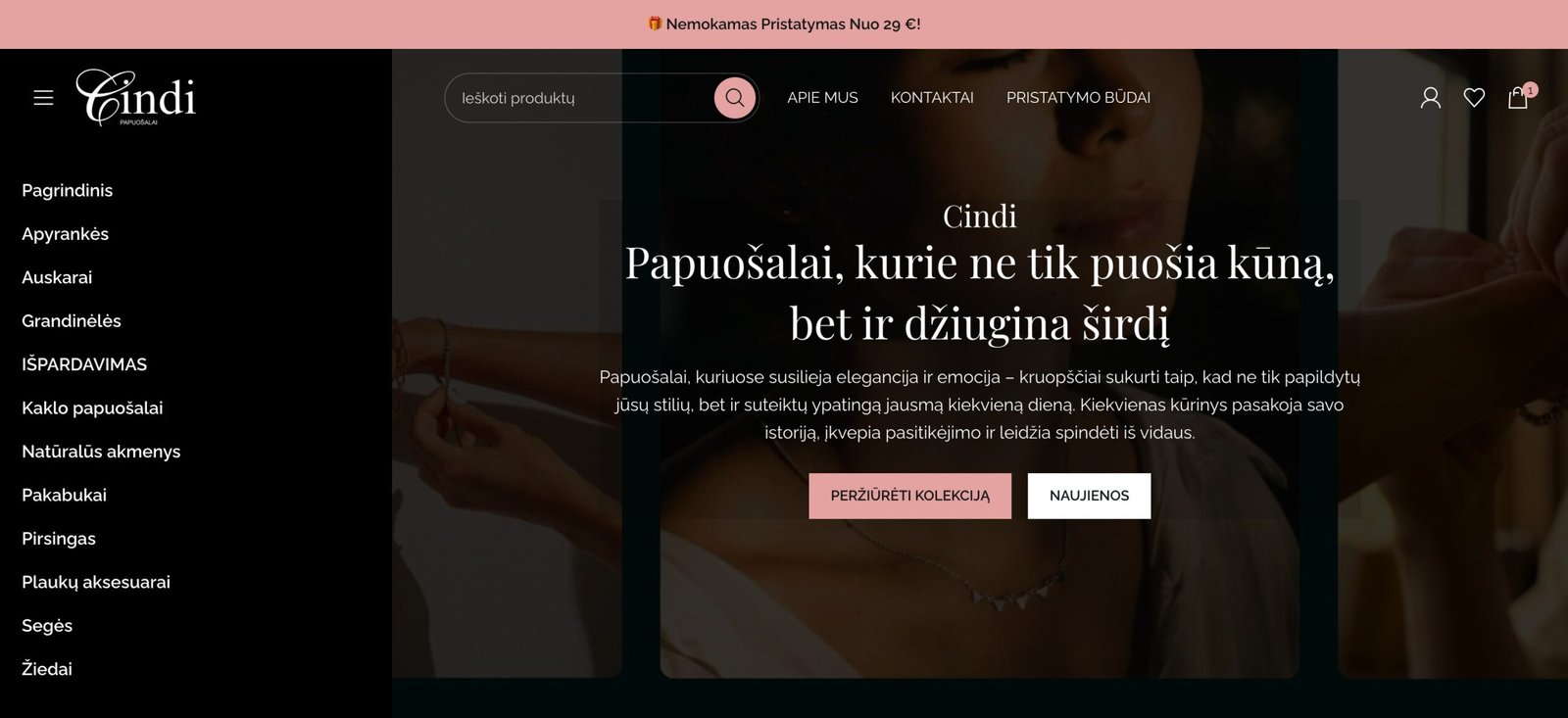 Pagrindinis puslapis suformuotas kaip prekės ženklo pristatymo ir pardavimo derinys. Viršuje komunikuojamas nemokamas pristatymas nuo 29 €, kas iš karto stiprina vertės pasiūlymą. Toliau sekanti hero komunikacija, naujienų blokai, populiariausių produktų zona ir kategorijų pristatymas leidžia vartotojui suprasti, ką siūlo parduotuvė ir kokiai auditorijai ji skirta. Svetainėje matomi aiškūs kategorijų įėjimai į apyrankes, auskarus, grandinėles, žiedus, pakabukus, natūralių akmenų papuošalus ir kitus aksesuarus, todėl parduotuvė turi tvarkingą ir SEO prasme stiprią informacinę struktūrą.